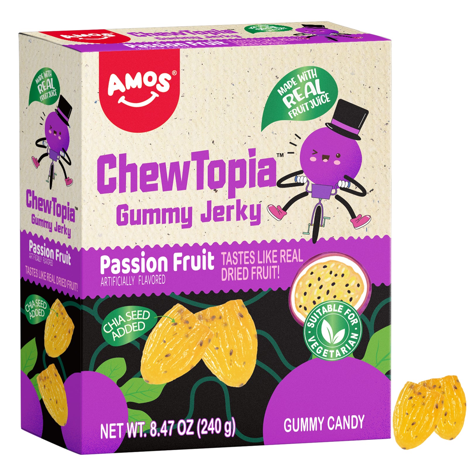Savourez le goût authentique et acidulé du vrai fruit de la passion séché dans chaque bouchée d'Amos Gummy Passion Fruit Jerky, offrant une collation aux fruits moelleuse et végétalienne.